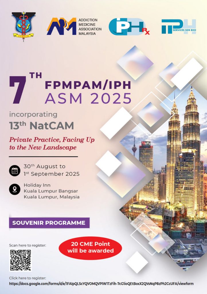 The Addiction Medicine Association of Malaysia (AMAM) and the Federation of Private Medical Practitioners’ Associations, Malaysia (FPMPAM) organised the 11th National Conference on Addiction Medicine (11th NatCAM). The first session was held on 23rd May 2021 (Sunday) and was attended by more than 70 practitioners. The second session is scheduled for 30th May 2021 (Sunday) from 1100 to 1600 hrs.